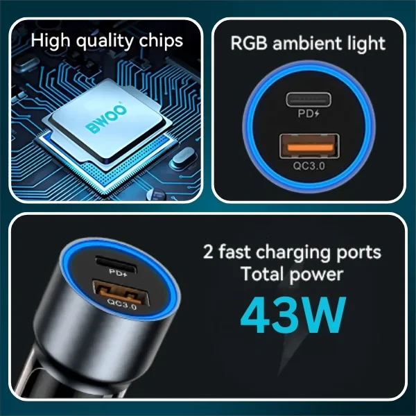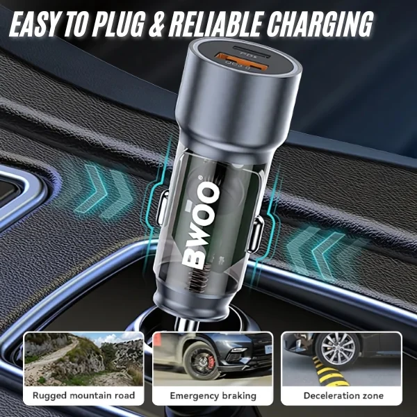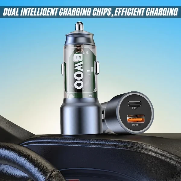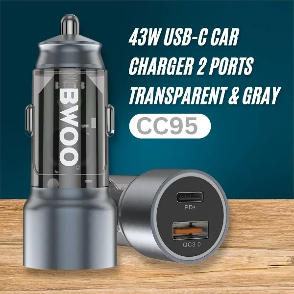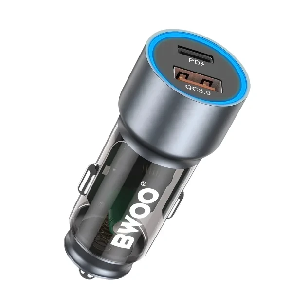 The Bwoo Fast Car Charger (CC85) is a compact and efficient 38W dual-port car charger featuring both USB-A and USB-C outputs. Designed with a transparent PC+ABS shell, it offers a sleek, tech-inspired look while ensuring durability and stability during travel. The charger supports fast charging for a variety of devices, including smartphones and tablets, and is equipped with multiple safety protections to safeguard against overcharging and short circuits. Compatible with vehicles operating at 12V to 24V, it's an ideal companion for on-the-go charging needs.