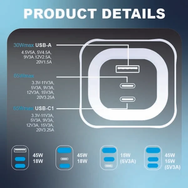 | Features | Foldable, 3-Ports, 65W Fast Charging, Portable, Easy to Carry, Free 60W USB-C Cable |