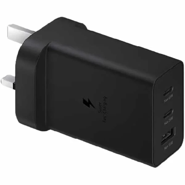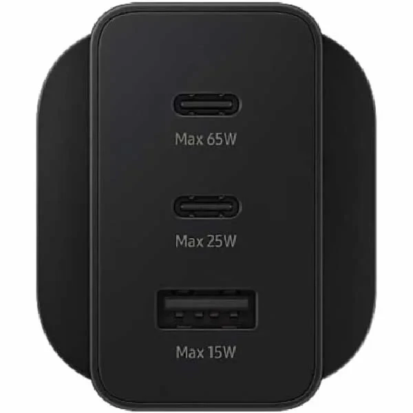 The Samsung Galaxy Official 65W Trio Super Fast 2.0 Travel Adapter (EP-T6530) is a compact, high-performance charger designed for versatility and speed. Featuring two USB-C ports and one USB-A port, it allows you to charge up to three devices simultaneously. The primary USB-C port supports Super Fast Charging 2.0 up to 45W, while the second USB-C and USB-A ports offer up to 25W and 15W respectively . Its universal compatibility ensures optimal charging for a wide range of devices, from smartphones to laptops. Safety features include protection against overcurrent, short circuits, and high temperatures .