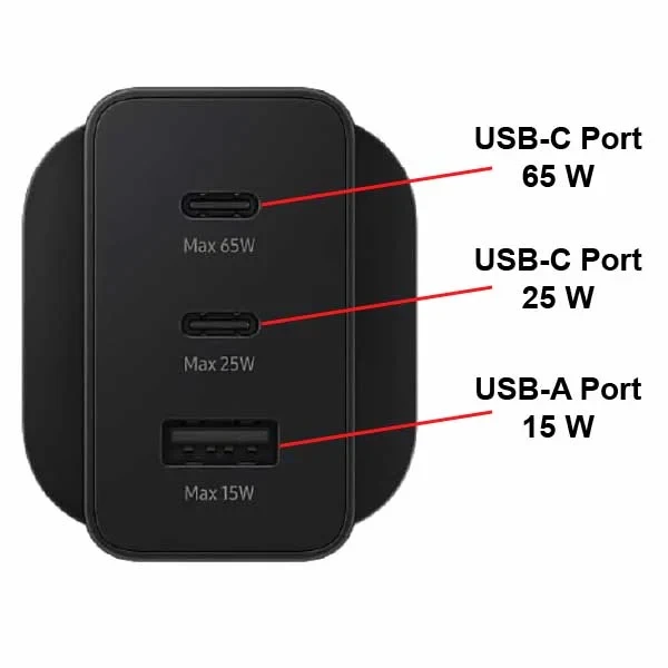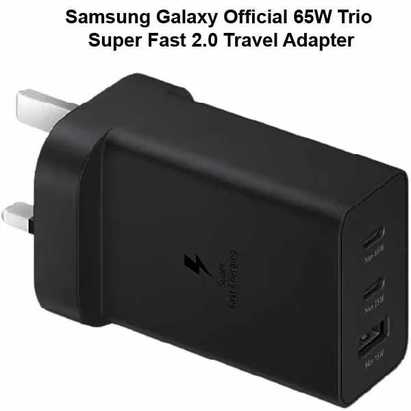 Official Samsung 65W Trio Travel Adapter with Super Fast Charging 2.0 support.