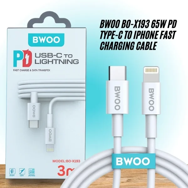 The BWOO BO-X193 is a 3-meter USB-C to Lightning cable engineered for rapid charging and data transfer. Supporting up to 65W Power Delivery, it ensures efficient charging for iPhones and other Lightning-compatible devices. Crafted from durable TPE material, the cable offers flexibility and resilience against wear. Its intelligent E-Marker chip provides safe and optimized power delivery, protecting your devices from potential damage. Ideal for users seeking a reliable and long-length charging solution.