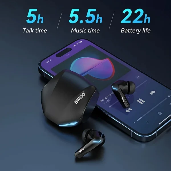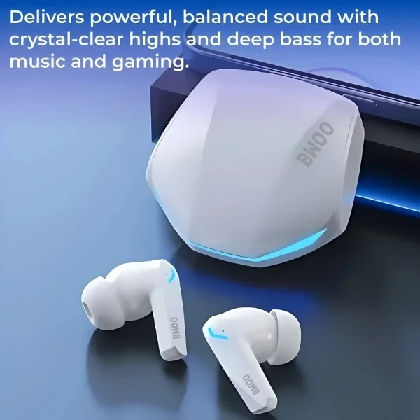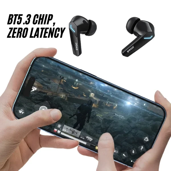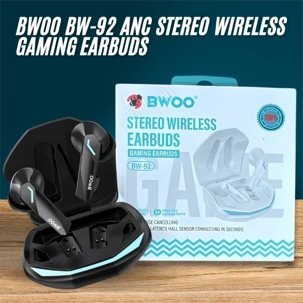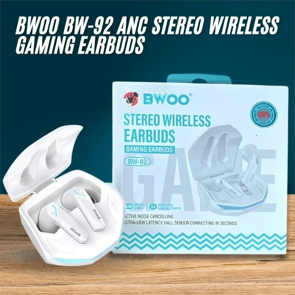 The BWOO BW-92 ANC Stereo Wireless Gaming Earbuds are designed for immersive gaming and sports experiences. Equipped with Bluetooth 5.3, they ensure a stable, low-latency connection for seamless audio. Advanced ENC (Environmental Noise Cancellation) technology minimizes background noise, allowing clear communication during intense sessions. The earbuds feature a Hi-Fi stereo sound profile with deep bass and crisp highs, enhancing audio clarity. With an ergonomic in-ear design and intuitive touch controls, they offer comfort and convenience for extended use.