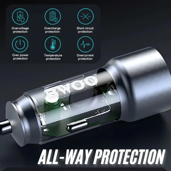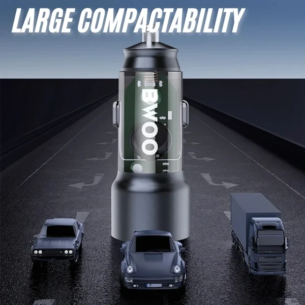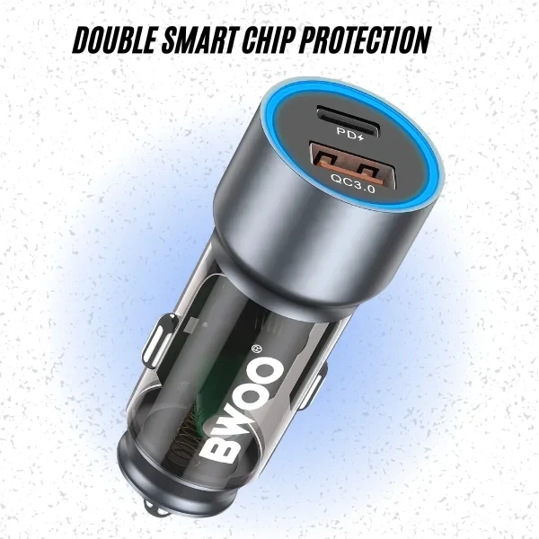 The Bwoo Fast Car Charger (CC85) is a compact and efficient 38W dual-port car charger featuring both USB-A and USB-C outputs. Designed with a transparent PC+ABS shell, it offers a sleek, tech-inspired look while ensuring durability and stability during travel. The charger supports fast charging for a variety of devices, including smartphones and tablets, and is equipped with multiple safety protections to safeguard against overcharging and short circuits. Compatible with vehicles operating at 12V to 24V, it's an ideal companion for on-the-go charging needs.